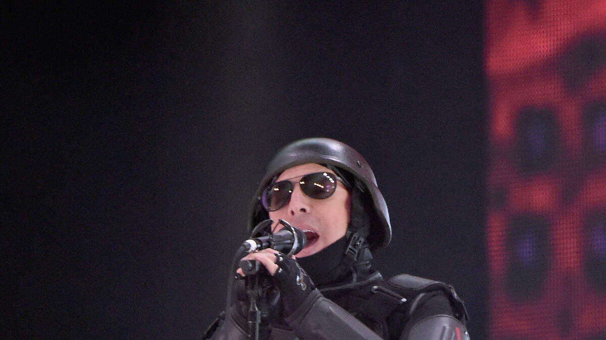 Maynard James Keenan performed in a blonde wig, lipstick, and prosthetic breasts.